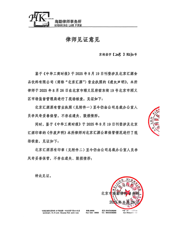 为说明北京汇源营业执照和公章未发生遗失,上述人士展示了一则律师见证意见。该意见来自于海勤律师事务所的律师,其内容为律师于2025年8月26日在北京市顺义区市场监督管理局进行了现场核查,北京汇源原有营业执照和公章均由该公司总裁办公室人员李凤奇妥善保管,不存在遗失、毁损情形。